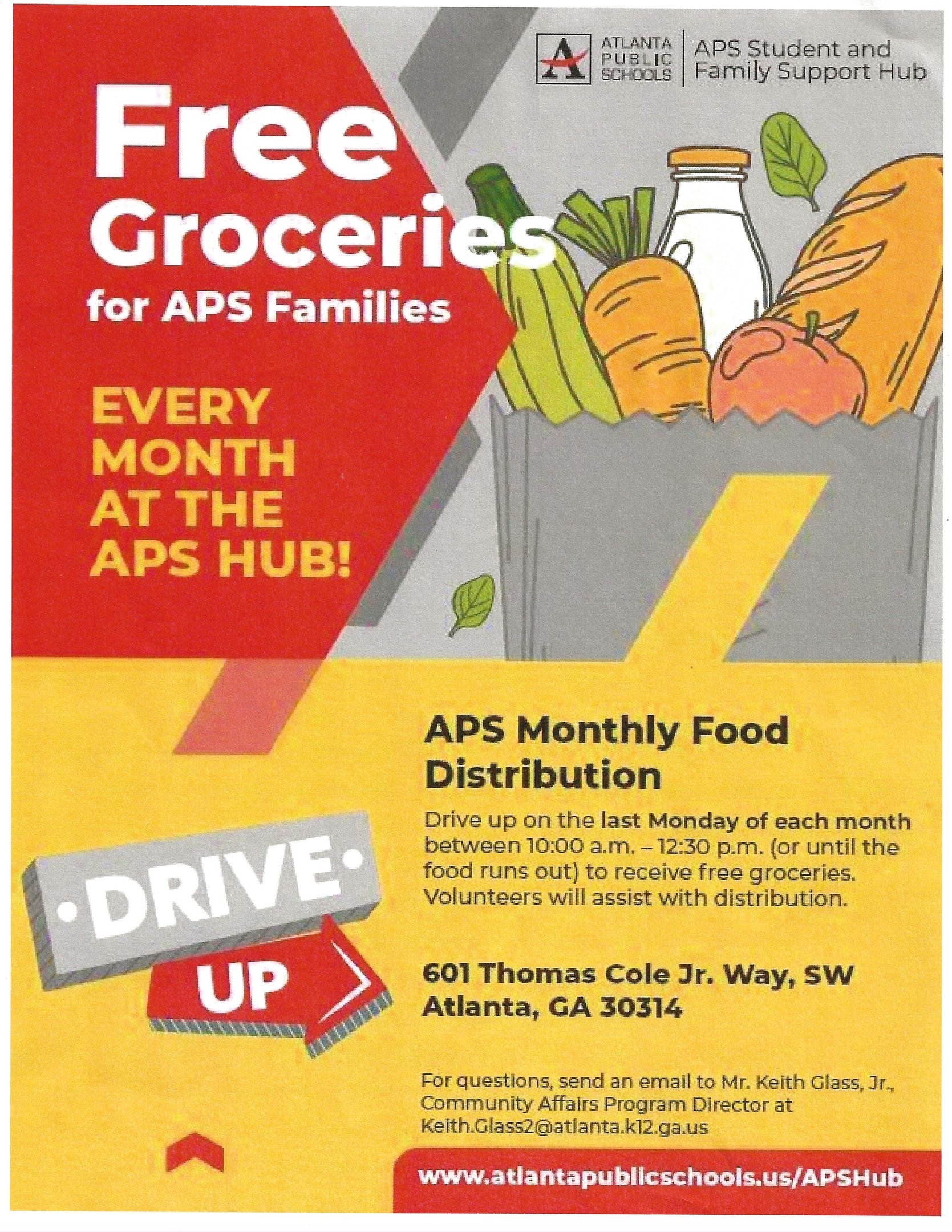 Atlanta Public Schools is supporting families through a monthly food distribution event held the last Monday of each month, beginning at 10:30 a.m. at the APS Student & Family Support Hub (601 Dr. Thomas Cole Jr. Way SW). No sign-up needed — just drive up! More info here.